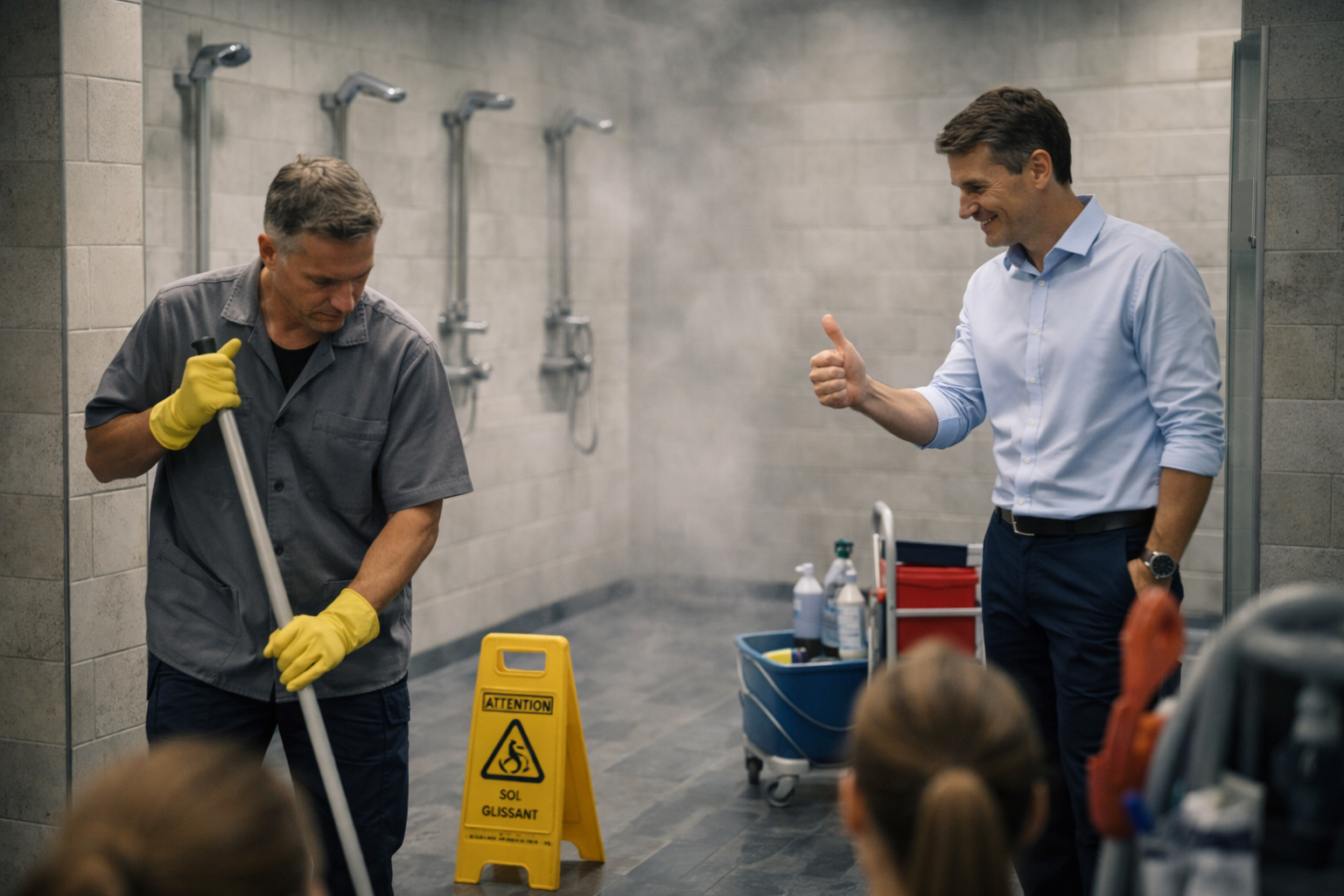 un agent d’entretien qui tient un niveau d’hygiène irréprochable en période de forte fréquentation ;